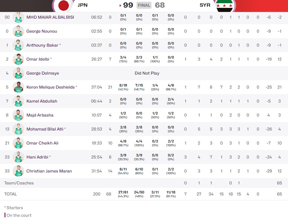 خسر منتخبنا الوطني للرجال لكرة السلة مباراته الأولى بنهائيات كأس آسيا المقامة حالياً في جدة السعودية أمام منتخب اليابان بفارق (31) نقطة 68/99 بعد أن إنتهت أرباع المباراة 18/13-14/28-28/10-39/17 حيث بدأت المباراة بتقدم ياباني سريع 8/0 وتأخر منتخبنا بالتسجيل بسبب الرقابة الصارمة على كيرون وتسرع التسديد من تحت السلة عبر بلال وهاني ، وعاب منتخبنا ضعف لياقته البدنية حيث تراجع أدائه بشكل كبير في الشوط الثاني ولم ينجح بالمحافظة على تفوقه وتقدمه بفارق 9 نقاط (41/32) مع نهاية الشوط الأول بعد أن أنهى الربع الثاني متفوقاً بفارق (14) نقطة لتشير النتيجة مع نهاية الشوط الأول تقدم منتخبنا بفارق (9) نقاط (41/32) وكان اللاعب المجنس بصفوف منتخبنا كيرون ديشيلد أفضل لاعب والأكثر تسجيلاً برصيد 21 نقطة فيما سجل كريستان ماران 14 نقطة وعمر الشيخ علي 10 نقاط وعمر إدلبي 7 نقاط وكامل عبد الله 2 نقطتان ومجد عربشة 4 نقاط وبلال آطلي 4 نقاط وهاني إدريبي 6 نقاط ، وعاب منتخبنا بالمباراة ضعف التسجيل من خارج القوس حيث سجل ثلاث تسديدات فقط من 11 محاولة بنسبة 27.27% ، مما يذكر أن منتخبنا سيخوض مباراته الثانية أمام منتخب غوام مساء الجمعة القادم الساعة التاسعة مساء بتوقيت دمشق.